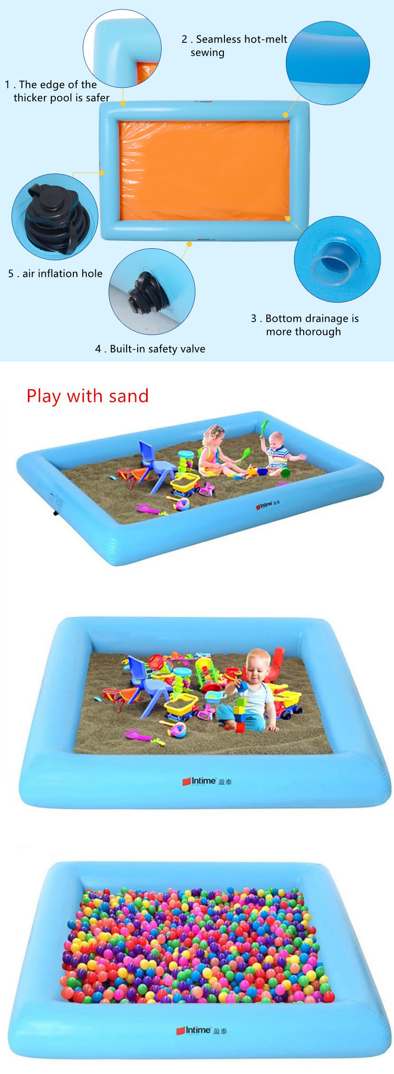 | รายละเอียดสินค้า | 🌞กระบะทรายเป่าลม ทรงสี่เหลี่ยม Inflatable Intime  Square shape sand blowing box 🌞 🌞 สระ กระบะใส่ของ เหมาะสำหรับ ใส่ทราย หรือ ของเล่นเพื่อประหยัดพื้นที่ ไม่ให้เกะกะ 🌞 วัสดุ PVC 0.25mm  🌞 ขนาด: 200*300 cm 🌞 สี: ฟ้า-ส้ม 🌞 น้ำหนักรวม :4 กก 🌞 ขนาดกล่อง:40 * 40 * 30 ซม.       |